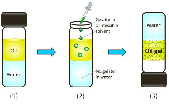 Adding a gelator in an oil-miscible solvent results in gelation of the oil without the need for heat or shear while leaving the water intact. The oil gel can hold its weight as well as that of the liquid water in the inverted vial.