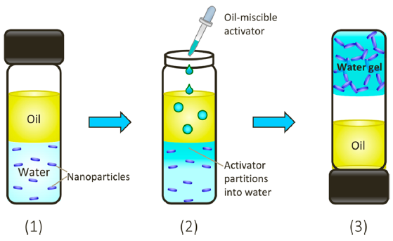 Initially, disklike nanoparticles of laponite are stabilized in the water phase, which is then contacted with the oil. An oil-miscible activator (e.g., butanoic acid) is then added to the oil. Some of the activator partitions into the water, whereupon it activates nanoparticle assembly into a gel. The water is thereby transformed into a gel without the need for heat or shear while the oil is left intact.